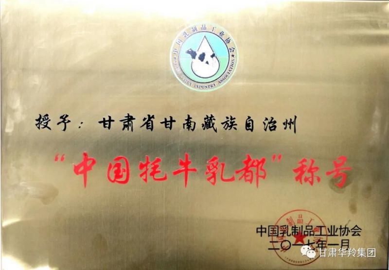 2017年1月,在甘南藏族自治州人民政府、甘南州工信局和甘肅華羚乳品集團(tuán)在內(nèi)的多方積極努力下,在中國乳制品工業(yè)協(xié)會(huì)的關(guān)心指導(dǎo)下,甘南藏族自治州榮獲了“中國牦牛乳都”榮譽(yù)稱號(hào)。