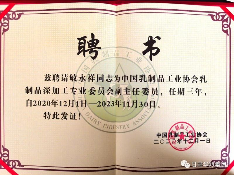 在乳制品深加工產品科學發展論壇暨乳制品深加工專業委員會成立大會上,甘肅華羚乳品股份有限公司被中國乳制品工業協會乳制品深加工專業委員會聘為副主任委員單位,甘肅華羚乳品股份有限公司董事長敏永祥受聘為中國乳制品工業協會乳制品深加工專業委員會副主任委員。